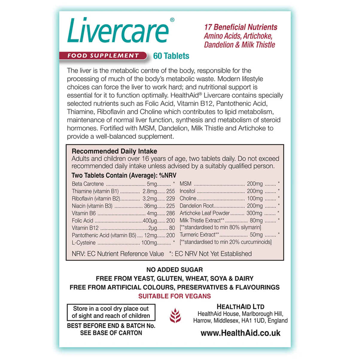 Livercare® tablets are carefully formulated with specific ingredients which contribute to normal liver health. Livercare contains Amino Acids, which aid new cell formation within the liver and Milk Thistle, which consists of Silymarin, which supports liver health. Other ingredients include Artichoke, which consists of Silymarin and Cynarin, which act as an antioxidant and assist in detoxification.